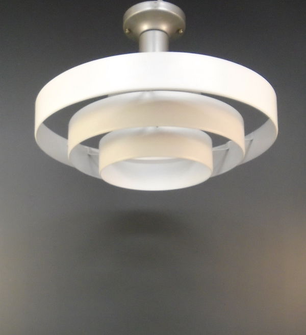 A gorgeous 1950s semi flush ceiling light with concentric "Saturn" rings made by Lightcraft of California. The design of this iconic light is credited to Kurt Versen. Has been rewired in our on site light repair workshop. May have some very minor age related blemishes. Photo is representational