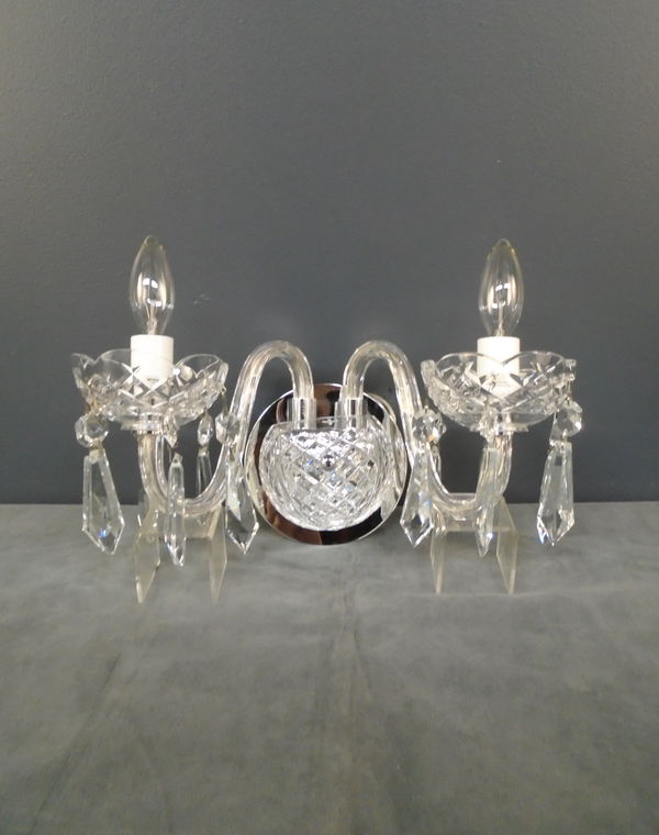 A pair of Waterford Irish crystal two arm wall sconces model B2 in the Comeragh pattern from the 1990s. The have the Gothic mark that was used pre 1999. This model is no longer in production.