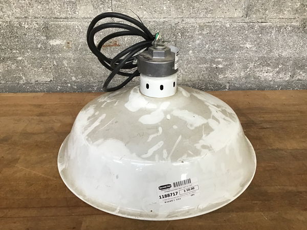 Vintage white enameled steel shade and fitter with a black plug in cord wired to it. Seems to work fine when plugged in.