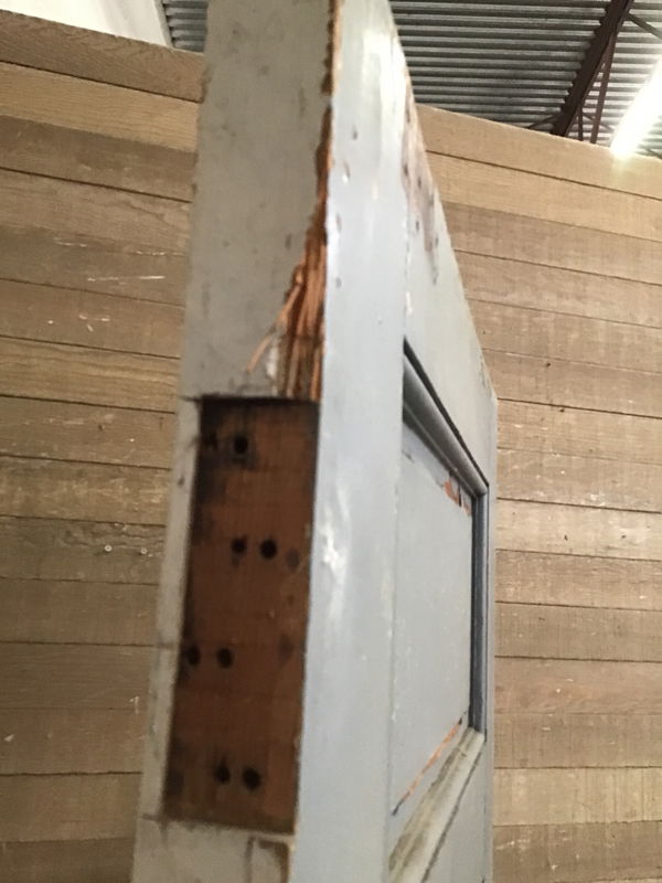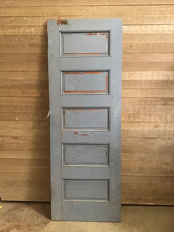Vintage 5 panel fir exterior door in solid shape including the panels. Paint is flaking off and will need a refinishing.