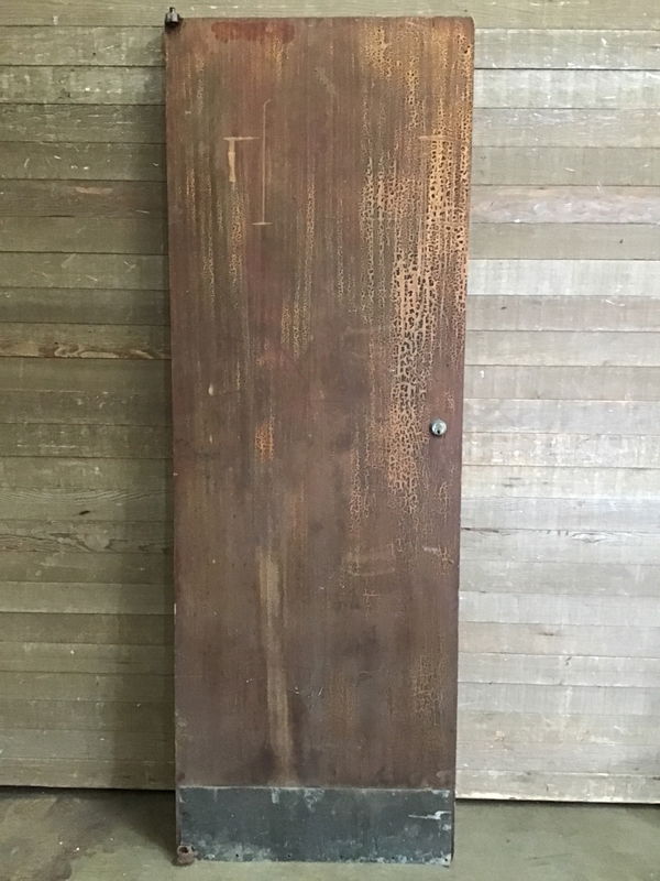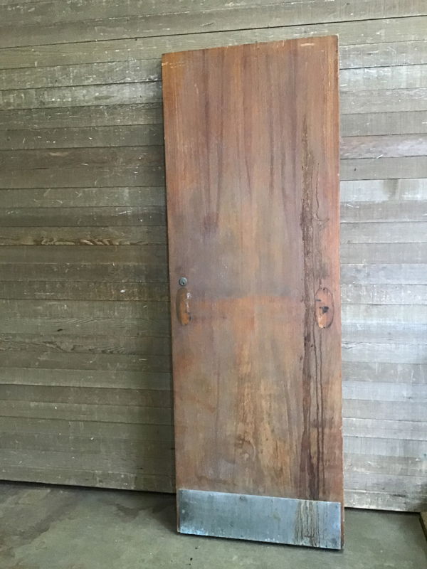 This is a hefty slab door from an auditorium! There is a fair amount of cosmetic damage and the veneer is starting to peel at the edges. It will need a refinishing.