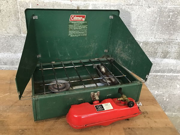A Coleman Model 425 camp stove with two burners. Seems to be in pretty good shape, though it'd benefit from a good cleaning.