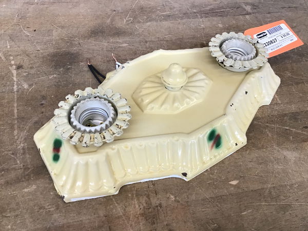 Uniquely shaped stamped steel pan light with a creme painted finish and red & green accents. This has some small chips and wear to the finish as well as a bit of paint remaining around the edges, but it has been given fresh sockets and a good scrub to remove most of the schmutz!