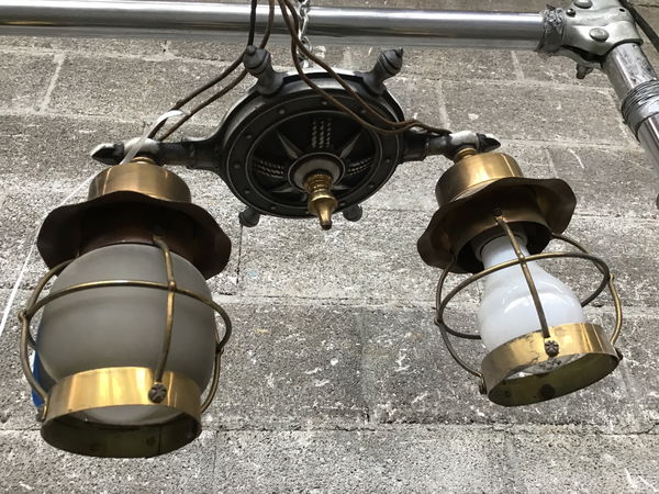 Vintage celling light with an adorable nautical vibe. It features 2 lights inside a opaque shade covered by a brass "cage". It's base looks a bit like a ships wheel and makes this a cheeky addition to any lakeside cabin, boathouse or anywhere else that you need to feel a little lost at sea. Price reflects it missing 1 shade and remaining shade cracked.