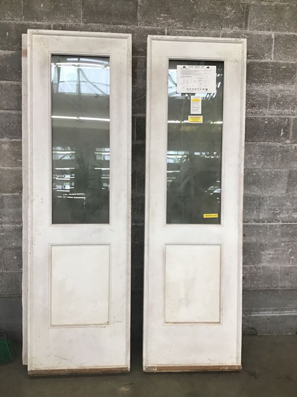 Pair of painted fir sidelites with insulated glass. Looks like they might have been briefly installed and warehoused. Made by Quantum in Everett, WA.