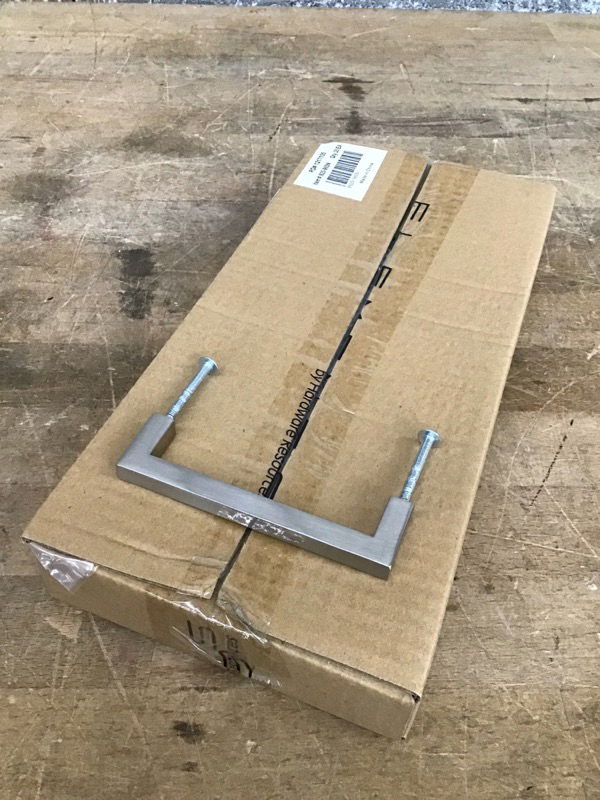 New, unopened box of Elements "Stanton" square cabinet pulls in a satin nickel finish. Twenty-five in the box. We got quite a few of these in at once, so if one box isn't enough to swap out your kitchen cabinet hardware there's plenty more! Check out full product specs here. Photo may be representational.
