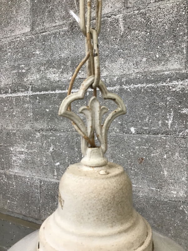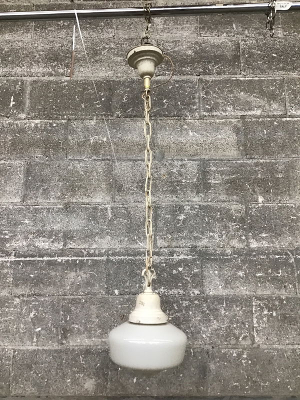 Vintage pendant light with a school globe. The fitter is topped by a fleur-de-lis pendant.