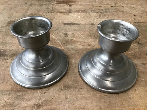 Pair of matching pewter candle holders. They could use a polish but don't have any deep scratches or dents.