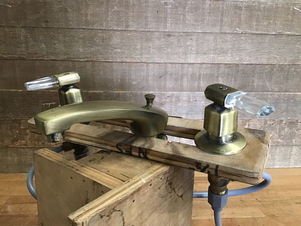 Cool bathroom faucet with an antiqued brass finish, and faux cut glass on the levers. Looks to be from the 70s, and is in good, used condition.
