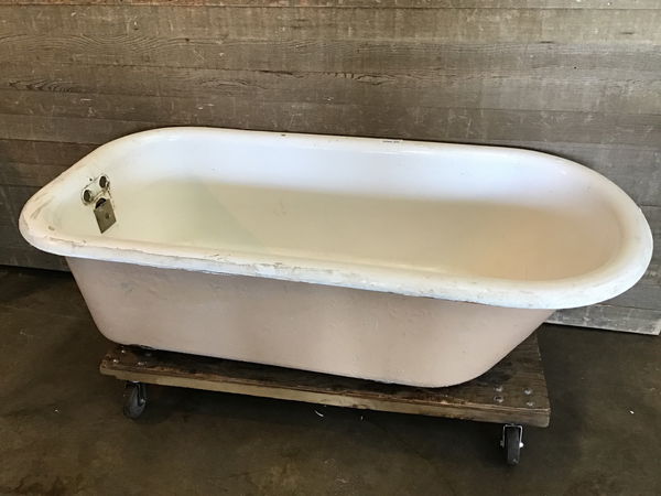Vintage 5' clawfoot bathtub. Significant wear and tear to the enamel underneath the faucet goes and some chips along the edge and rim but thankfully not where your butt goes. A good candidate for refinishing, but also useable as-is. Comes with a cool design overflow cover.