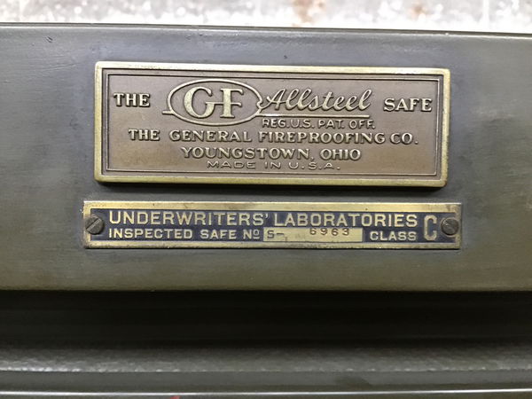 Vintage safe with working combination and adjustable shelves inside. This one is "The GF Allsteel Safe" made by the General Fireproofing Co. of Youngstown, Ohio. It's rated "Class C", which means it should withstand 1700 degrees Fahrenheit for up to one hour.