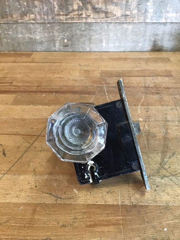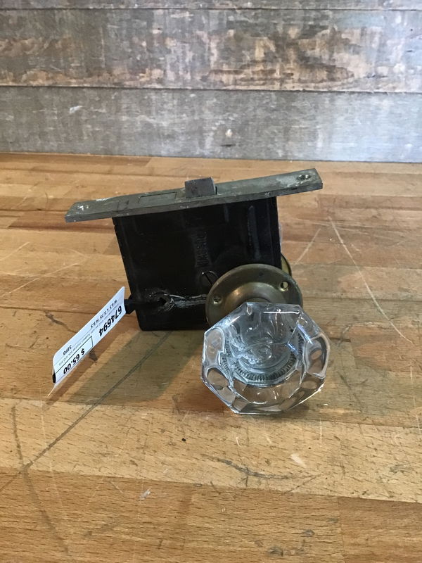 Vintage glass door knob set with Russwin mortise box and brass door plates.