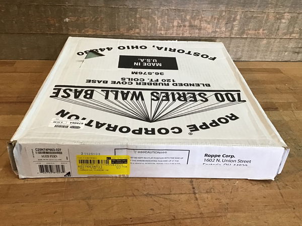 Never installed roll of 120' "Aged Fern" tone light green wall base. 2.5" tall. Great looking color. By Roppe Corporation. Colors may vary, and each box has a corner cut or folded open for viewing.
