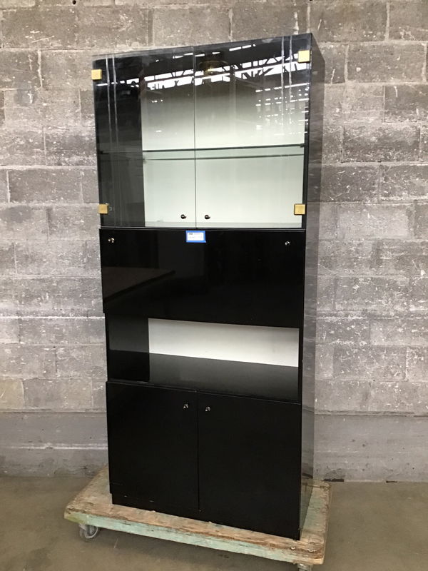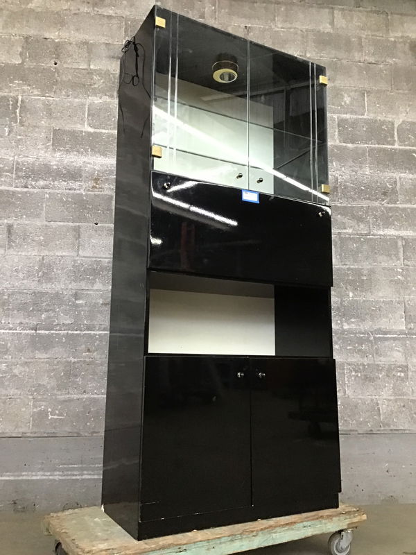 Very 1980s, very cool black lacquered cabinet with a lit glass door compartment above a fold down table top. This has contrasting brass accents in the hinges and knobs, giving it an even cooler edge. Add some glass racks for your stemware in the open cubby and this would be one sexy bar cabinet.