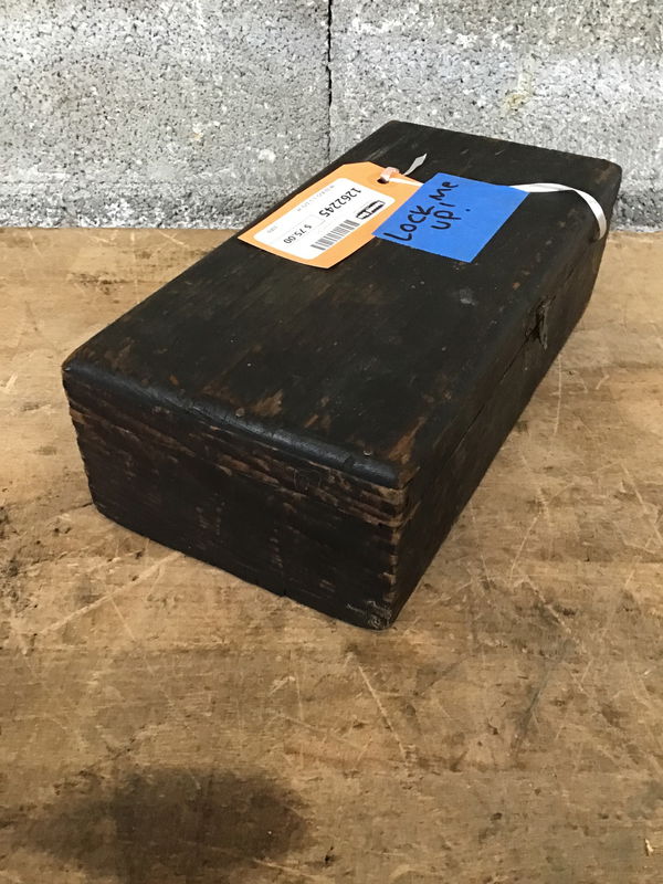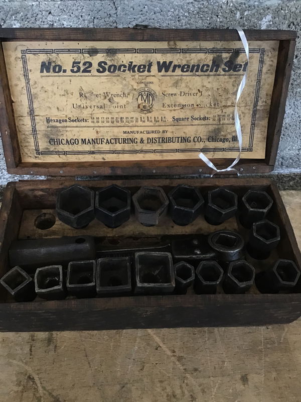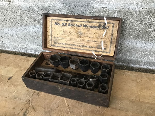 An antique set of socket wrenches by the Chicago Manufacturing & Distributing Company, the No. 52 set, which includes square and hexagonal sockets. It's missing the 27/32" square socket and the 1-6/32" hexagonal socket. Comes with both an antique ratcheting wrench and what looks to be some sort of old-timey breaker bar. All of this comes in the original wood carry box it was sold in, which has a small clasp, dovetailed joinery, and a black paint job.