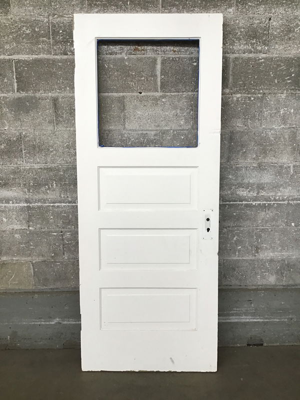 The glass is missing from this painted fir half lite with three raised panels down below. Price reflects.