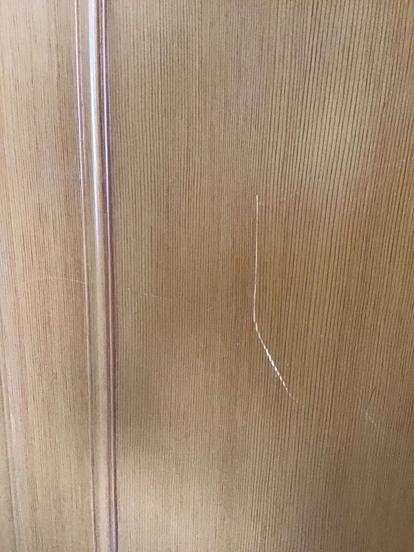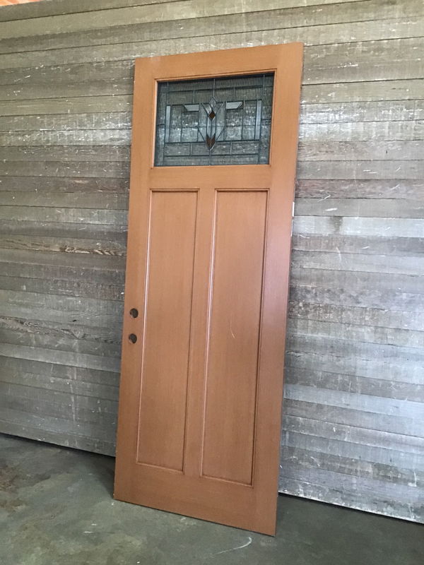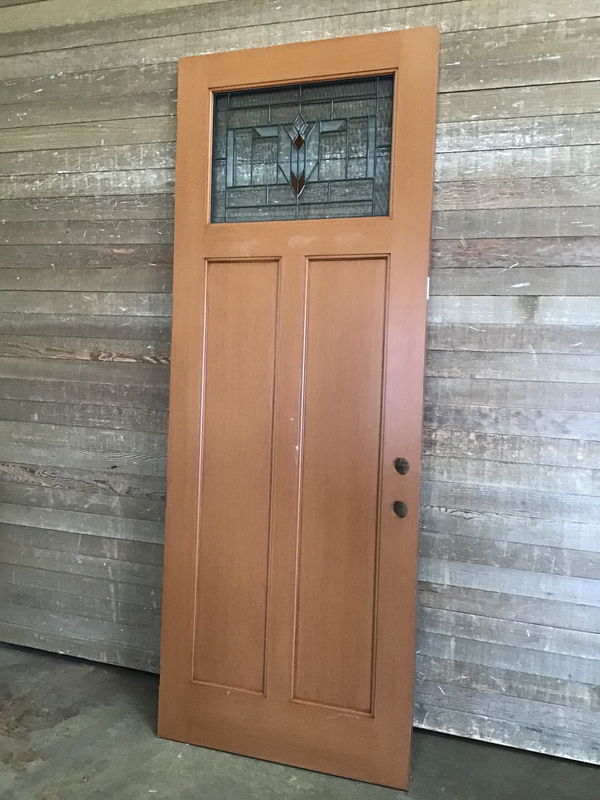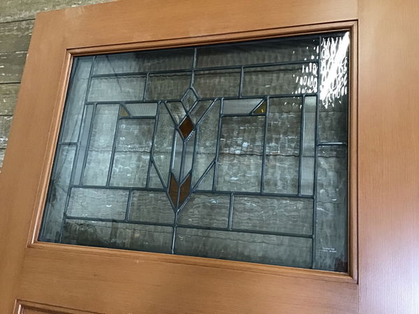 Stunning exterior door with a faux wood Fiberglass veneer. The small light at the top is leaded with both amber glass and obscured glass in an Art Deco inspired pattern. There is a small scratch on the front, but this can be covered easily. Has bore holes and right hand hinge cuts. This is an overheight door coming in at 95" tall.