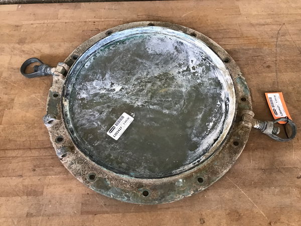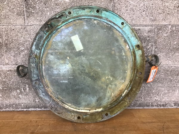 The 16 1/4" diameter plate glass is intact on this brass framed porthole window, but there's no exterior cover for it. The glass does not "open" on this one.