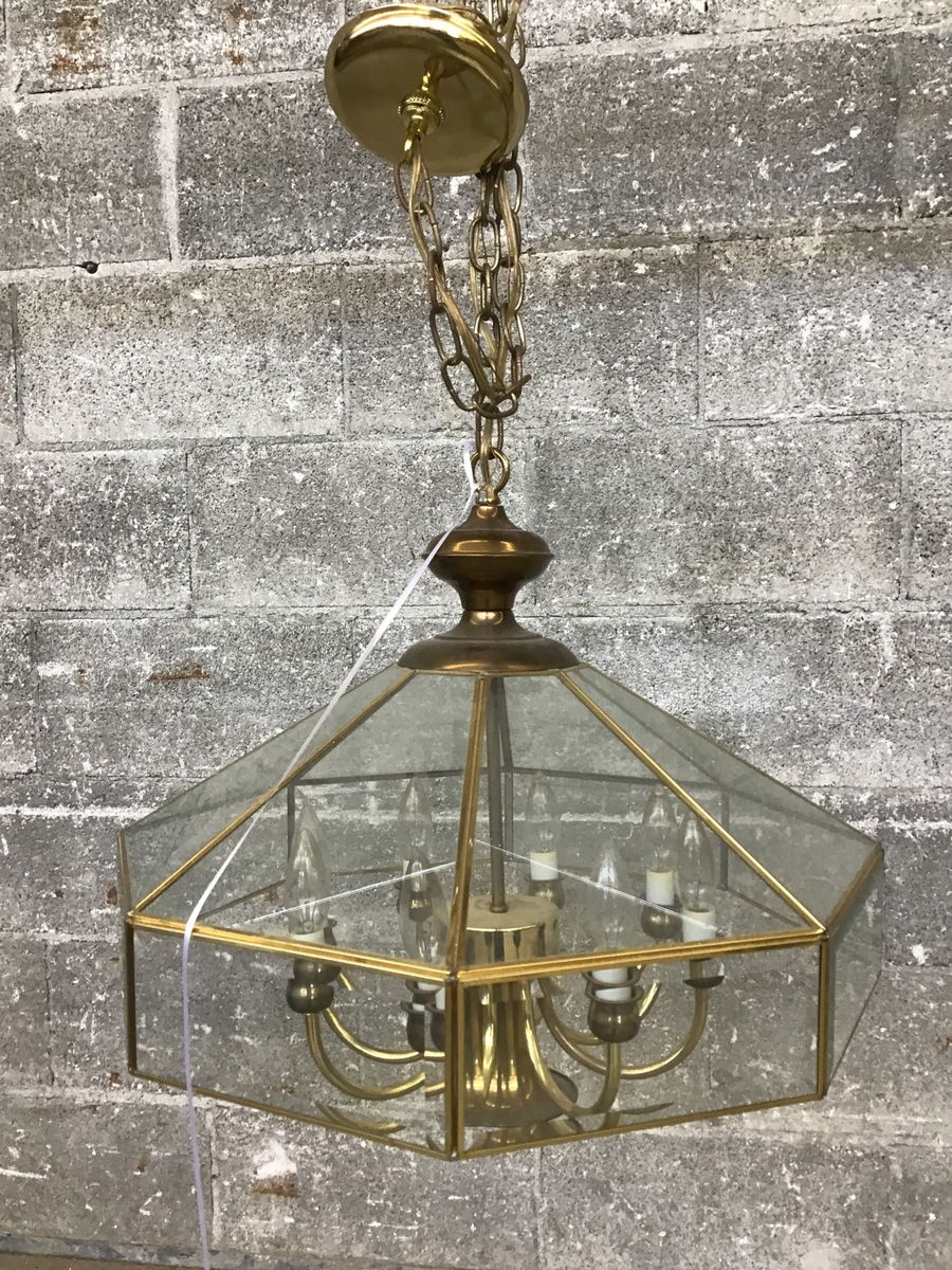 Almost classy 1980's era glass n' brass pendant fixture made by Isglo Lamps out of El Monte, Ca. feels like decent quality and the wiring looks healthy.