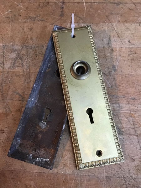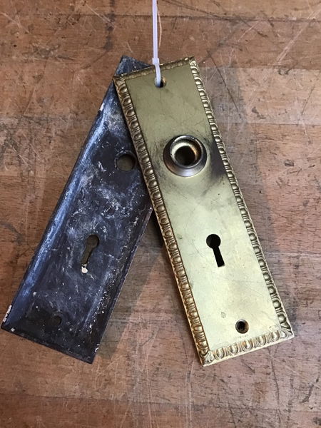 Vintage steel escutcheon pair with and egg and dart pattern around the edge. These look to be in pretty good shape, and previous owner did a decent gold paint job on them, though it is starting to wear off. Could be left as is with a nice patina or repainted!