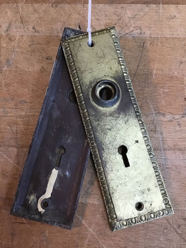 Vintage steel escutcheon pair with and egg and dart pattern around the edge. These look to be in pretty good shape, and previous owner did a decent gold paint job on them, though it is starting to wear off. Could be left as is with a nice patina or repainted!