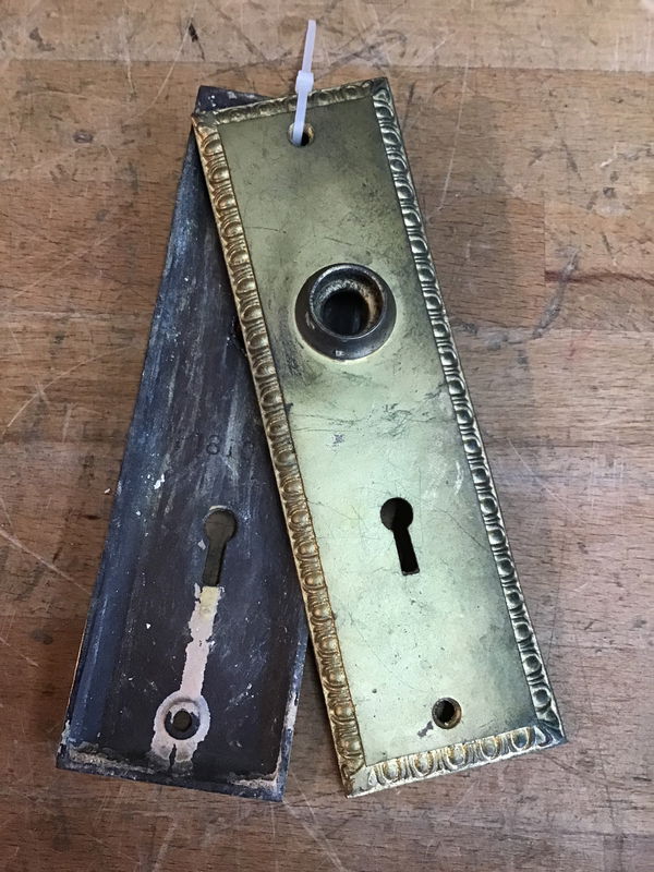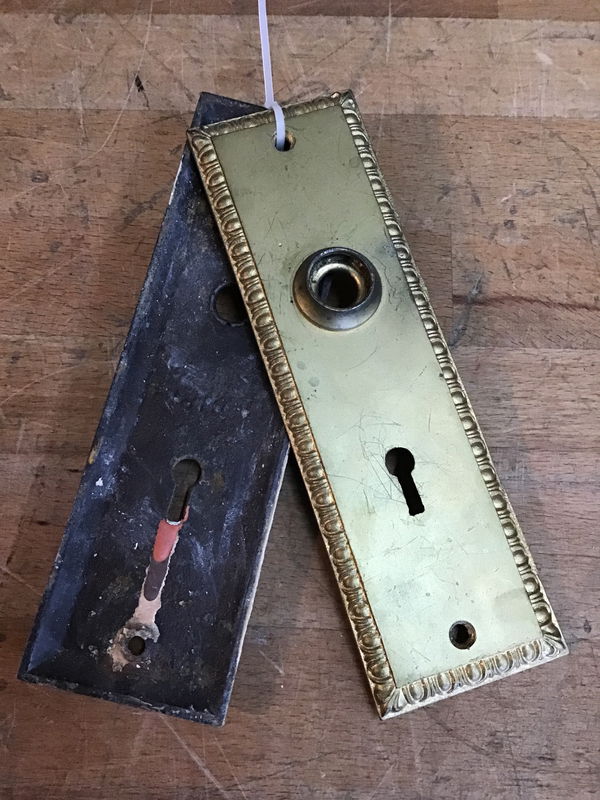 Vintage steel escutcheon pair with and egg and dart pattern around the edge. These look to be in pretty good shape, and previous owner did a decent gold paint job on them, though it is starting to wear off. Could be left as is with a nice patina or repainted!