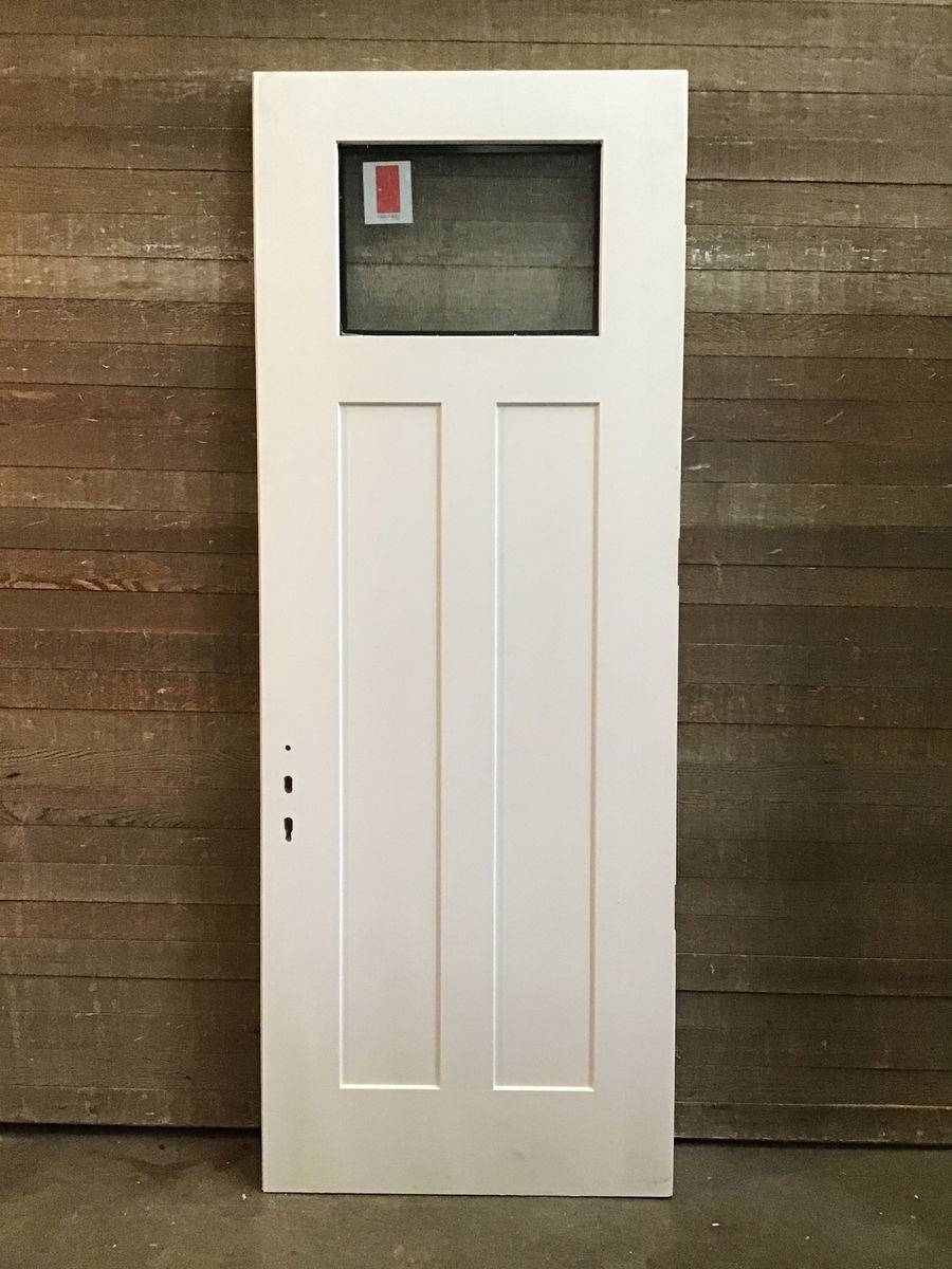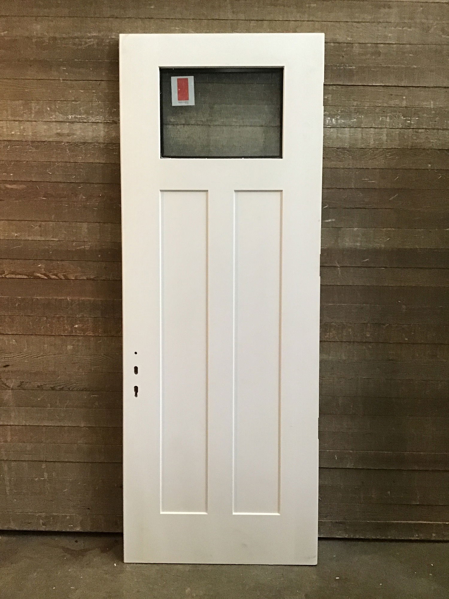 ThermaTru fiberglass-clad exterior door with obscure window at the top. Looks to be in good condition. It is drilled for a full length latch (= harder to find and higher $$), but it has potential to be an amazing front door.