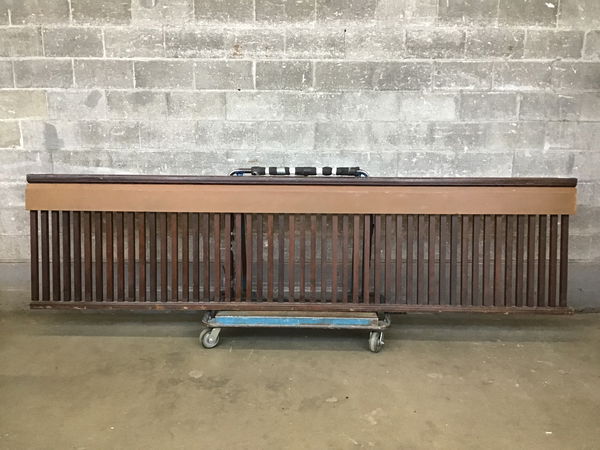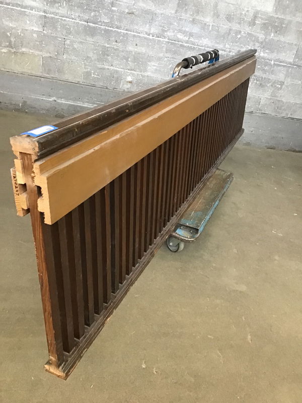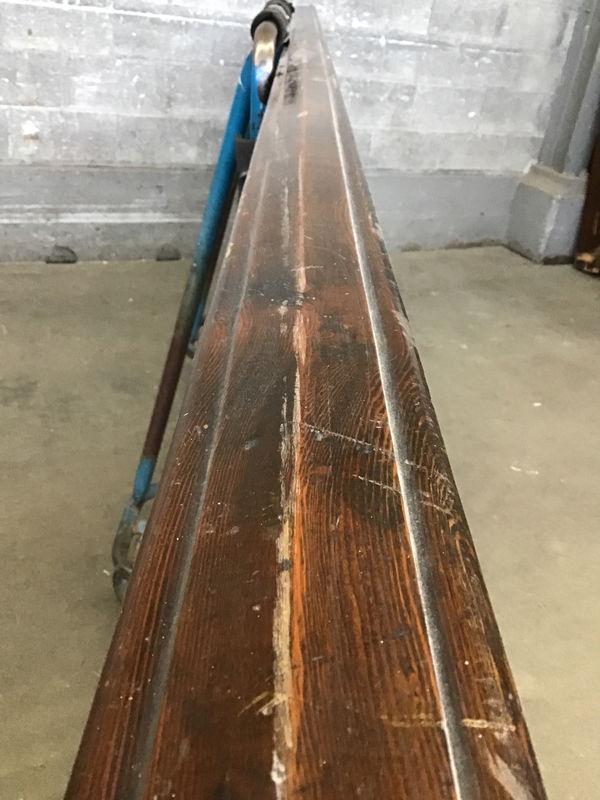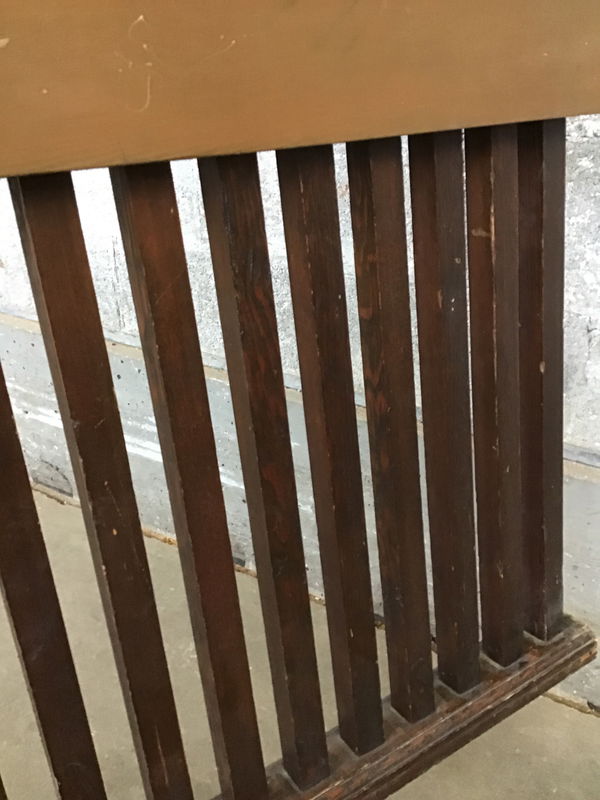 Approximately 11 1/2 foot long straight run of nicely stained vintage Fir railing. Some scratches are present along the handrail, but overall this is structurally sound and in good shape. Gaps between slats measure 1 1/2 inches which adheres to current building codes.