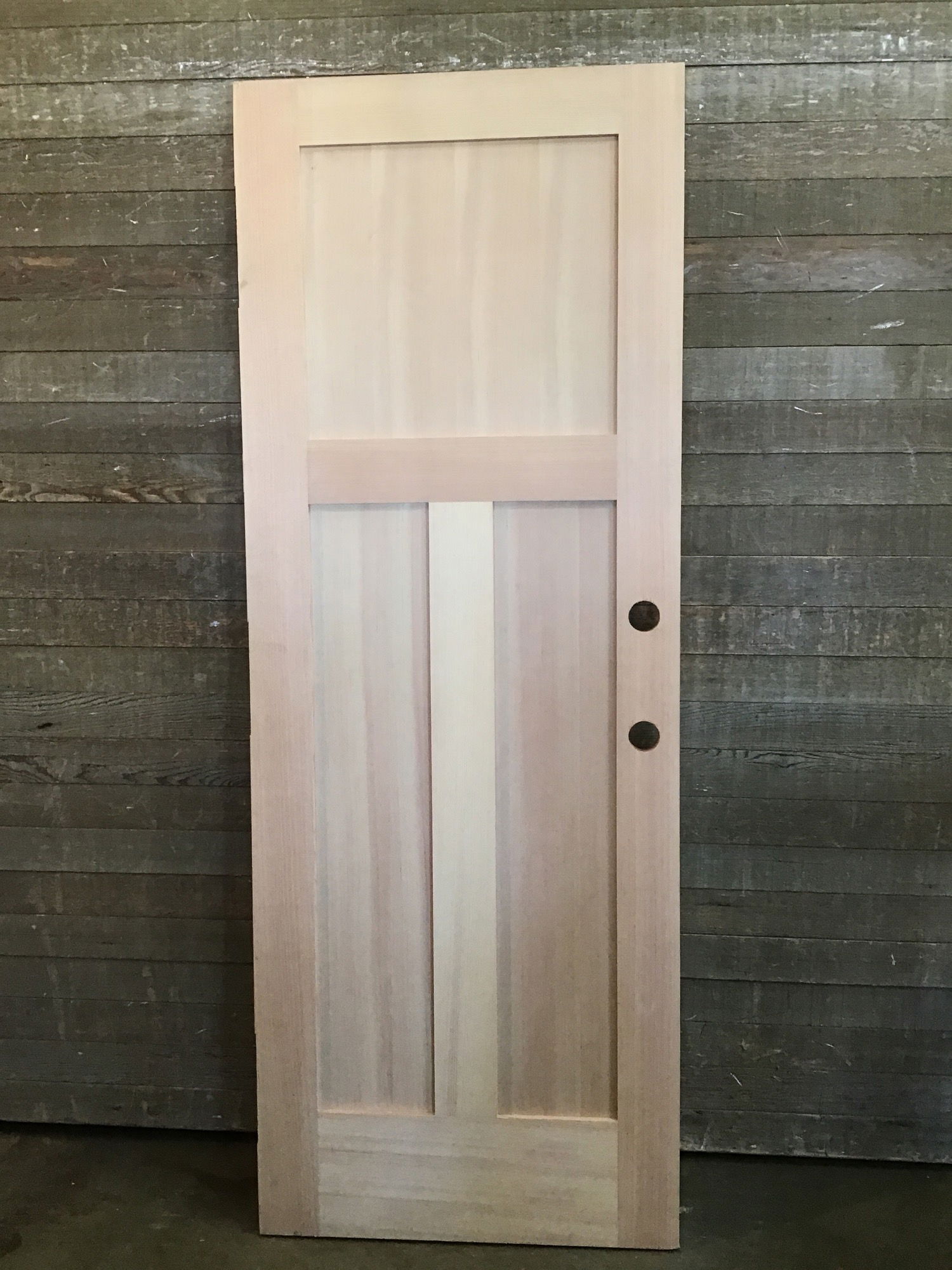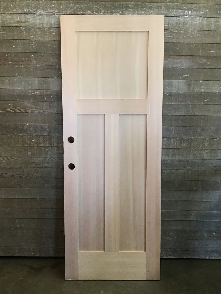 Never installed, 30" raw fir 3-panel interior door with quite a few hinge cuts that are all right hand swing. Has 2 bore cuts and some cosmetic damage but overall in good sturdy condition.