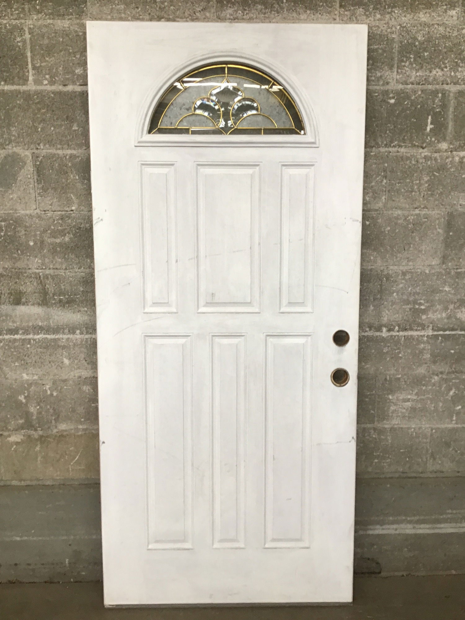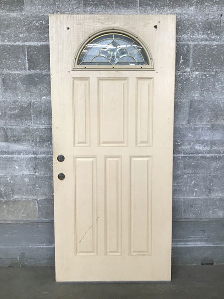 A vinyl-clad exterior entry door with a small lite up top with brassy leading and some obscured glass.
