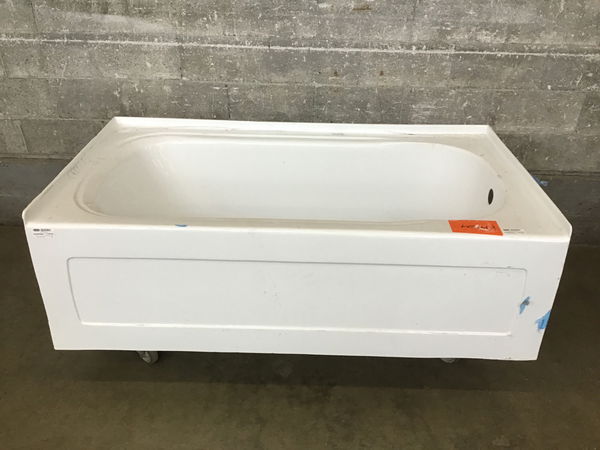 Right hand drain three wall alcove fiberglass tub that's never been installed. This tub appears to have been very slightly trimmed along the sides, and it's not the most accurate job which is probably why it ended up here instead of being installed. For someone who's going to do a tile job, this tub will be just fine! Send 'er bud!
