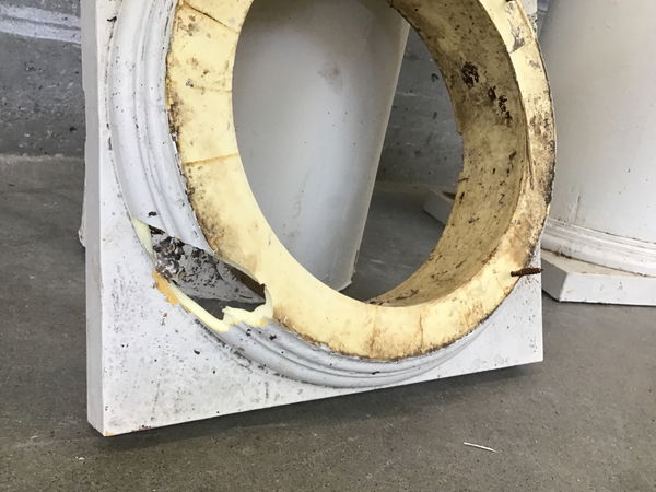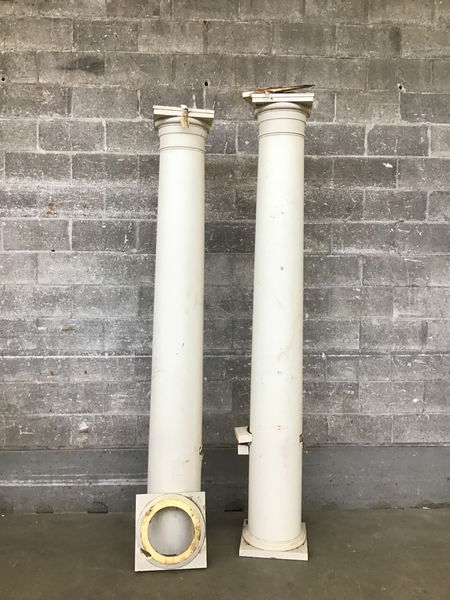 Pair of wood architectural columns. Have some wear and water damage toward the bottom, but would still be a great addition to your architectural project. Cap at the top measures 12 in.