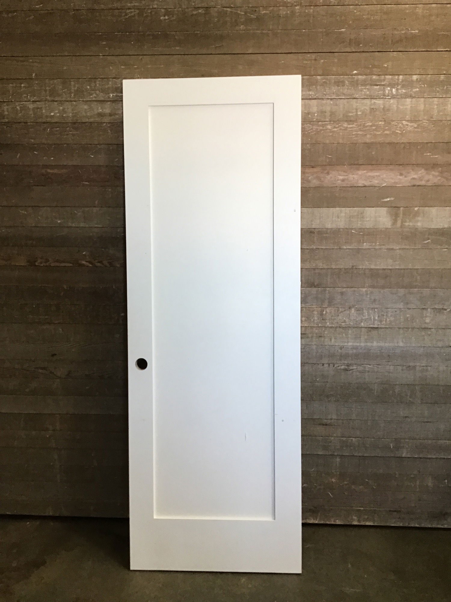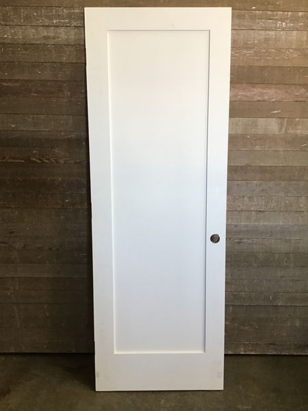 Primed masonite interior single panel shaker style door. In good never installed shape besides some minor scratches and scuffs. One side has been cut shorter by just under 1/4".