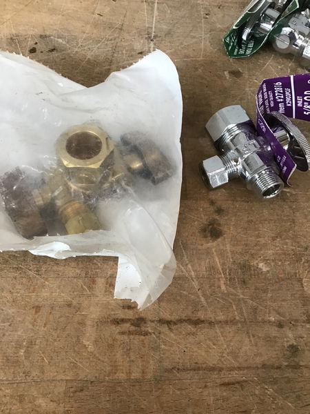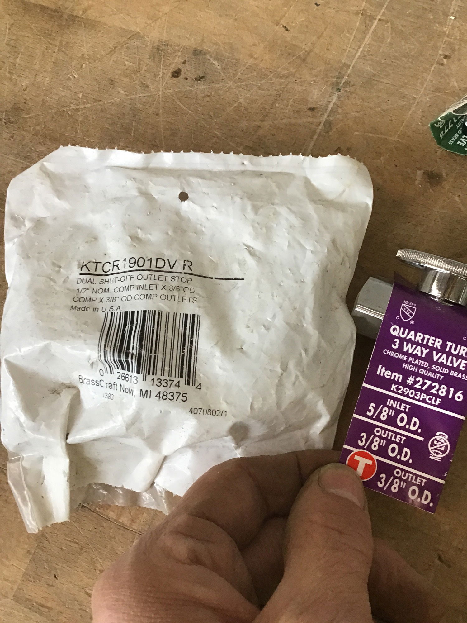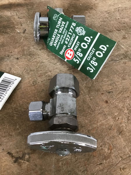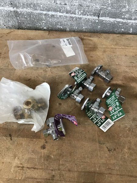 Seven 5/8" outside diameter inlet, 3/8" outside diameter outlet, shut off valves. Five are Keeney quarter turn angle valves (Item #271778), one is a Keeney quarter turn 3 way valve (Item # 272816), and one is BrassCraft dual shut-off outlet stop (#KTCR1901DVR)
