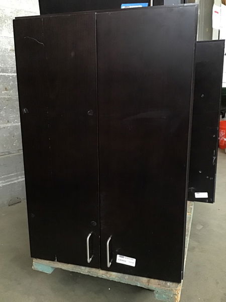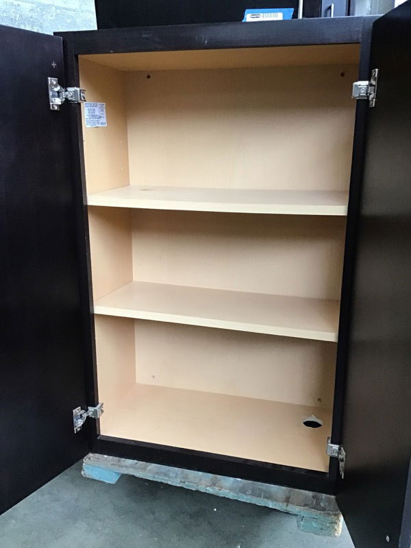 Modern stained upper cabinet with ply box construction and two shelves.