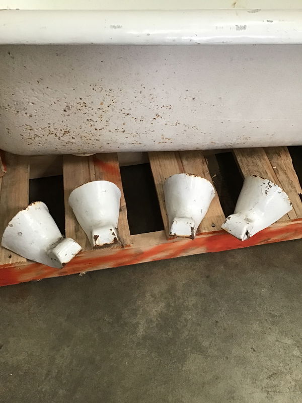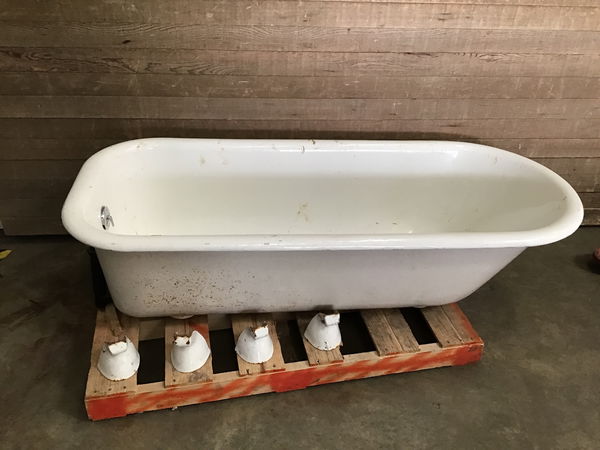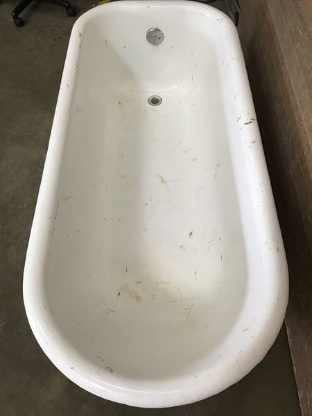 Nice 5.5' white cast iron clawfoot tub with all four feet! This tub is in good condition, with no chips or cracks. The enamel finish is starting to wear in places, and this will need a good scrub to get clean. Comes with all four claw feet, available in back upon purchase. Height listed does not include feet.