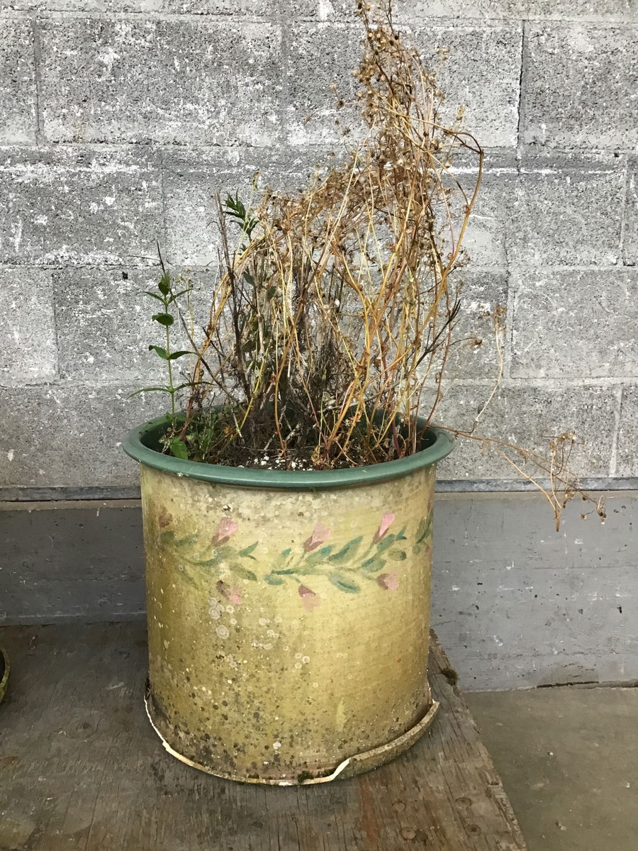 Delightful cottagecore hand painted ceramic planter, complete with soil and a few plants! Integrated saucer is damaged; price reflects.