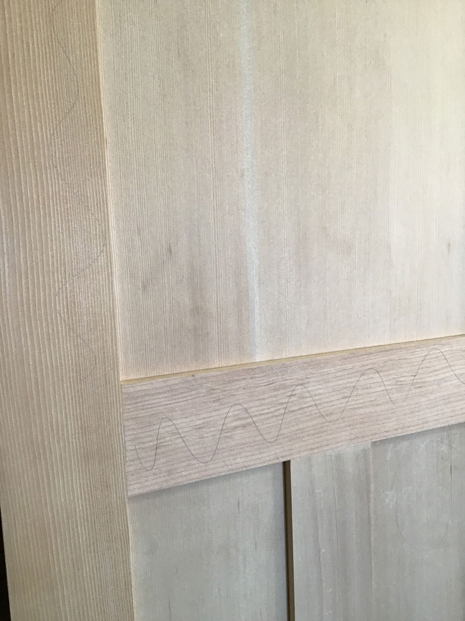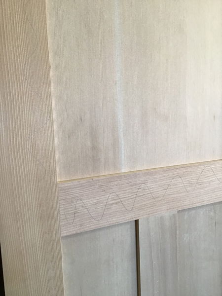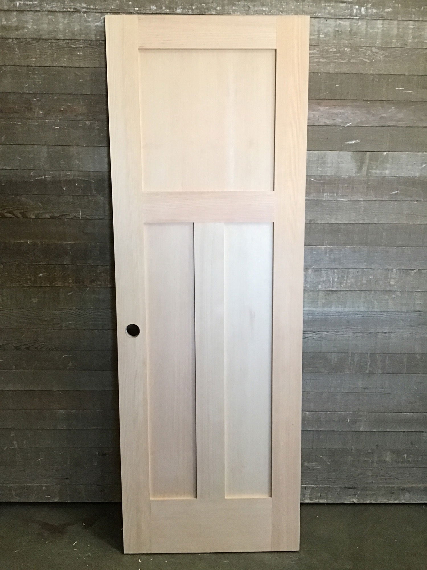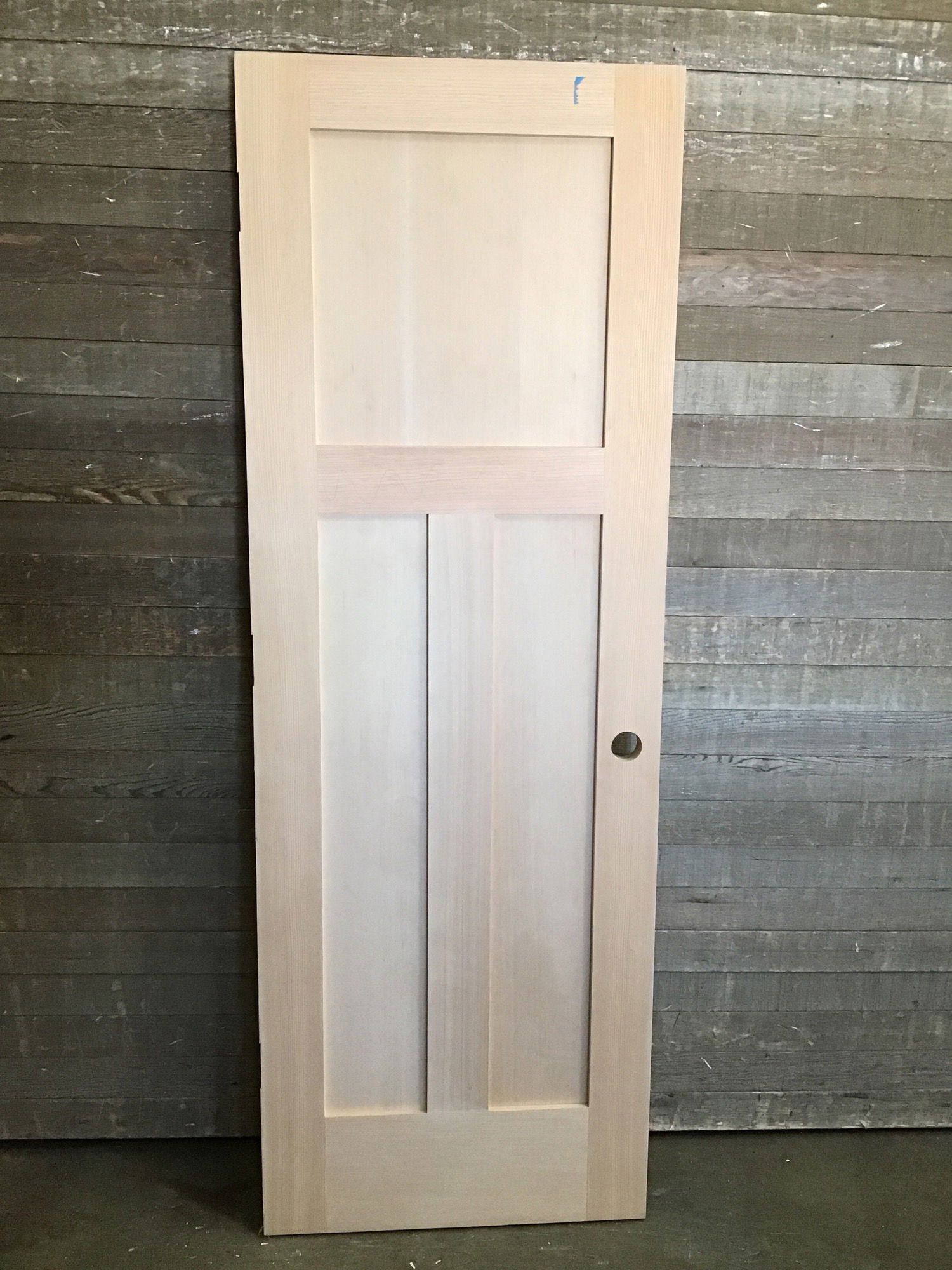 Unfinished 3 panel shaker style CVG hem/fir door. In great used shape with minor cosmetic imperfections and some penciling along the face. Will definitely need a little sanding.