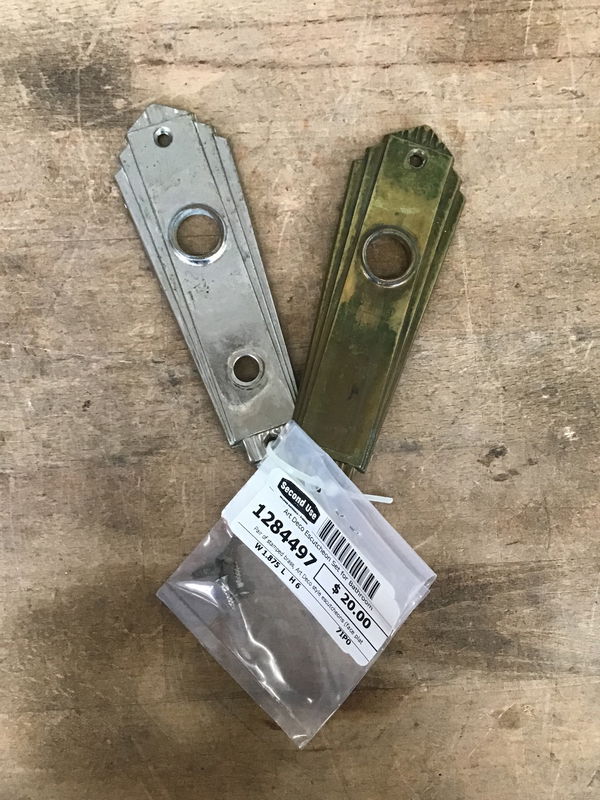 Pair of stamped brass, Art Deco style escutcheons (face plates) with most of their original finish and their mounting screws, but may have some light dents. This pair was on a bathroom door, with the chrome finished plate on the inside. The thumbturn for the lock has gone missing. Price reflects.