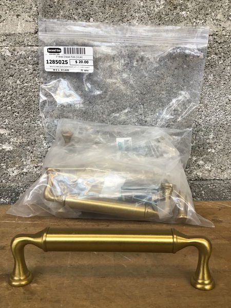 Set of 12 new Laurey brand drawer pulls with a satin brass finish. Mounting screws included.