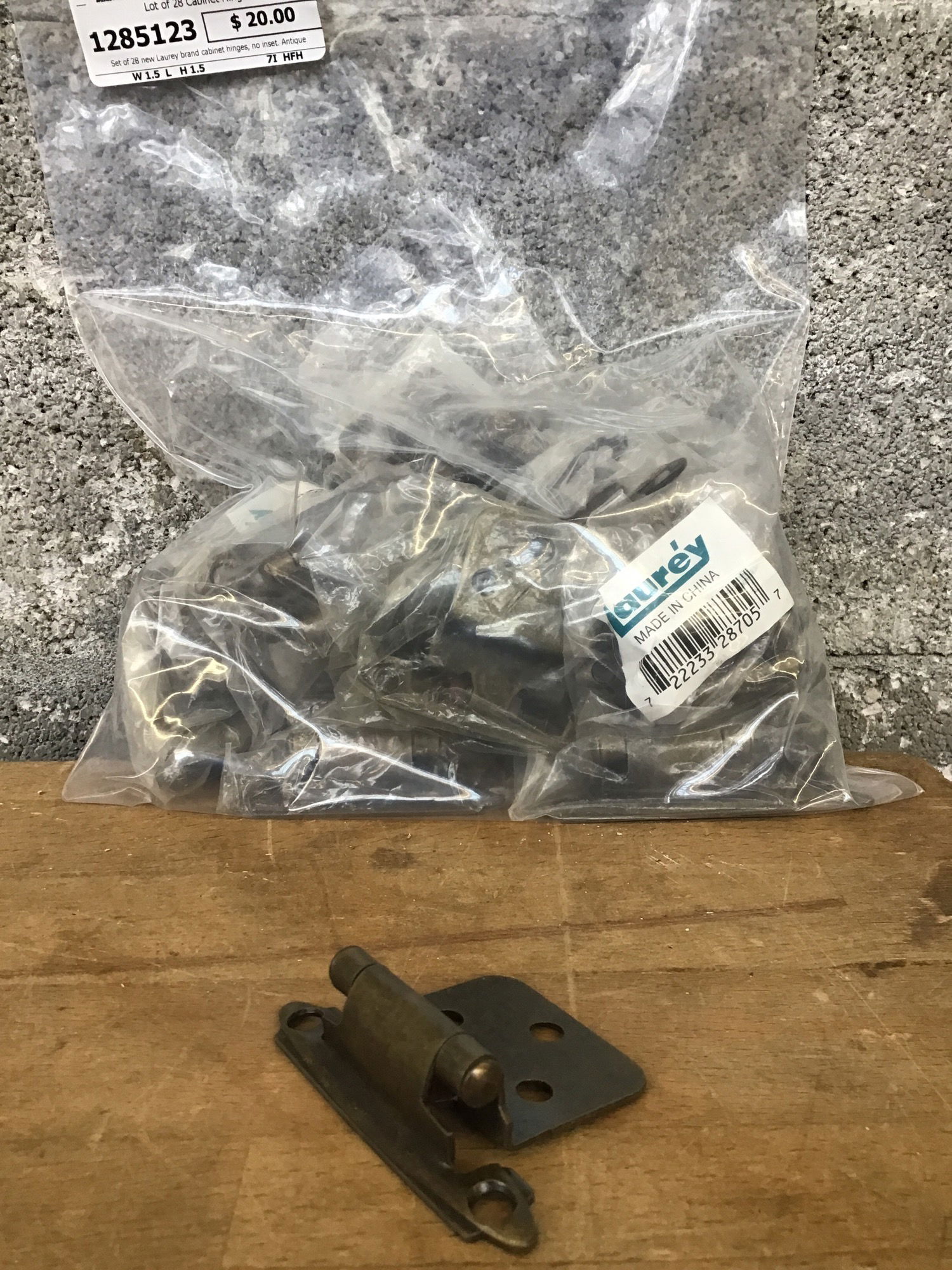 Set of 28 new Laurey brand cabinet hinges, no inset. Antique brass finish, mounting screws included.