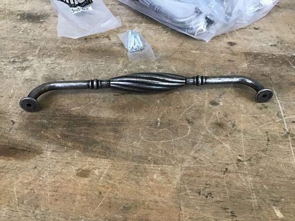 Set of 8 new MNG brand twisted drawer pulls with a distressed pewter finish. Mounting screws included. Photo may be representational.