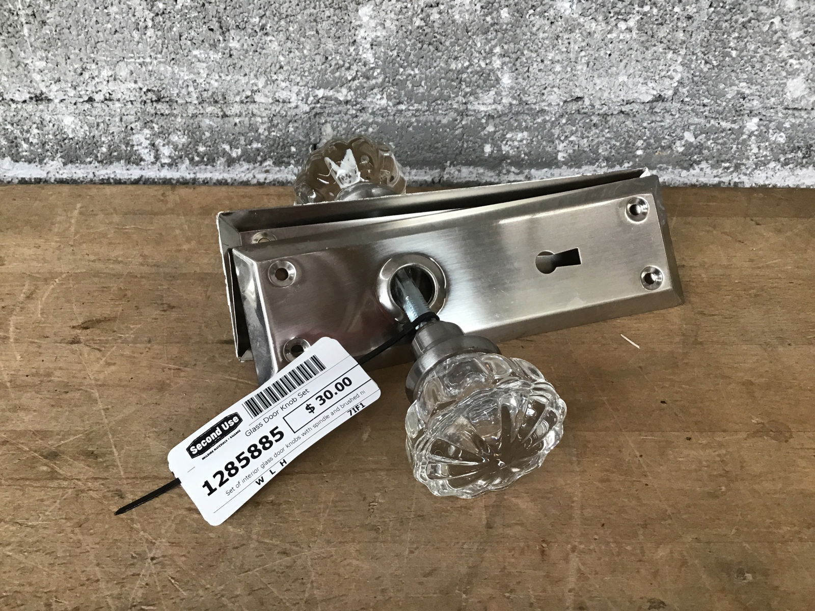 Set of interior glass door knobs with spindle and brushed nickel door plates.