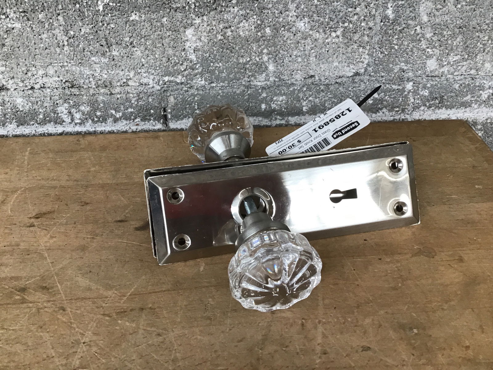 Set of interior glass door knobs with spindle and brushed nickel door plates.