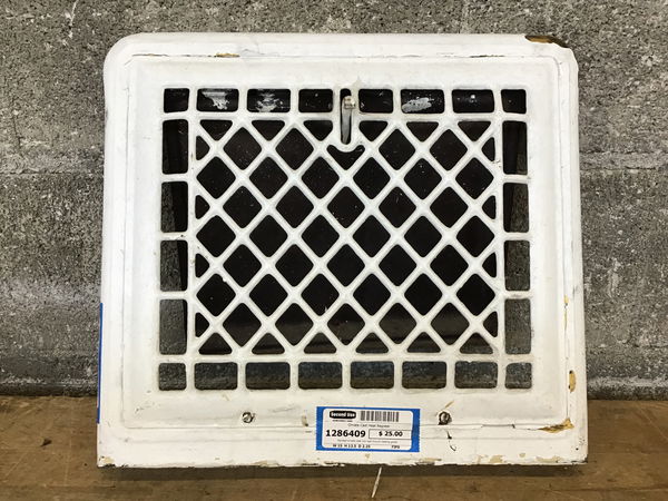 Painted ornate cast iron wall mount heating grate.