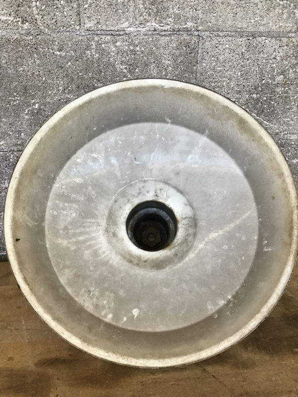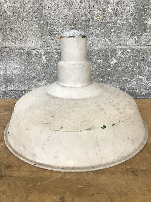 Green enameled farmhouse shade with a coat of white paint over top. A few rust spots but overall in good shape.