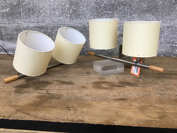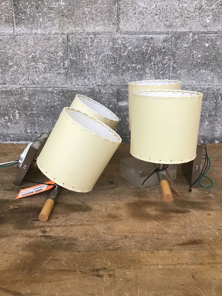Pair of Bover Mani 2-bulb sconces. Each has two paper shades,brushed nickel hardware, and the bars have decorative wooden ends.