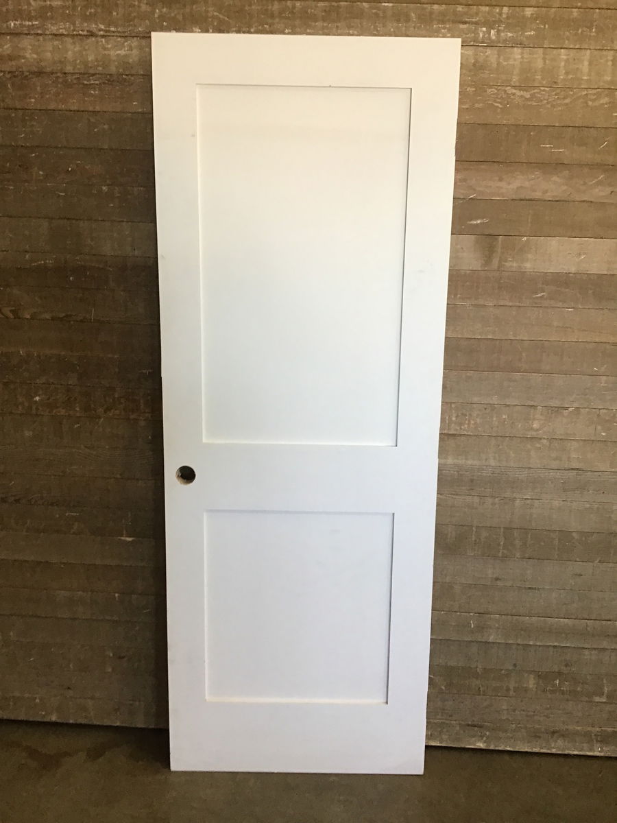 Primed MDF two panel interior door. Has been cut on the door hardware side by a 1/4".
