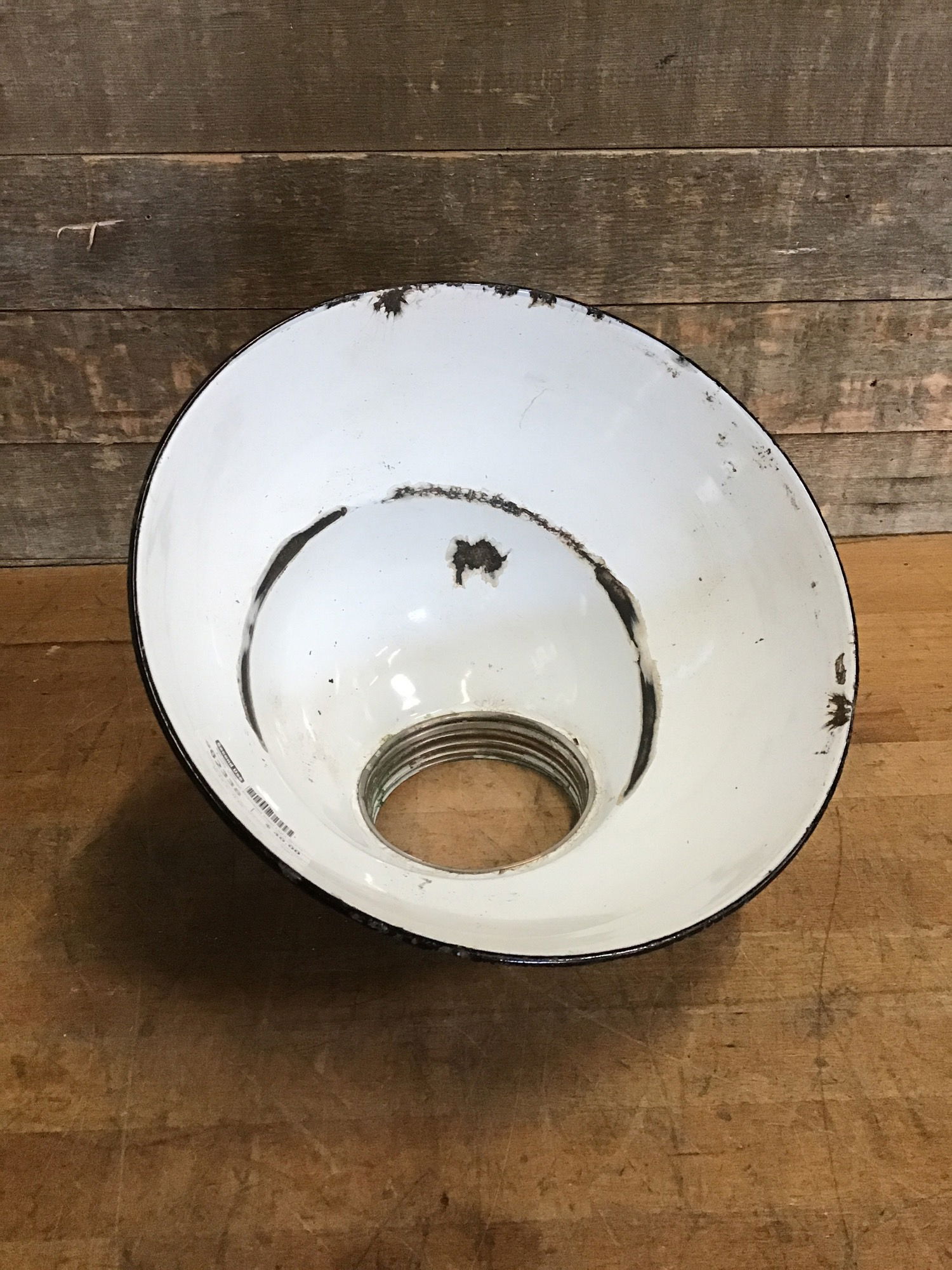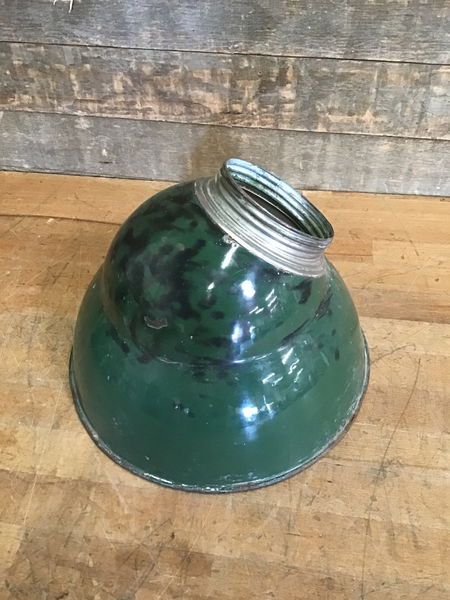 Vintage green enameled steel light shade with no bulb socket/fitter on top. Hole on top measures 4.25" in diameter. Has some chips and dings but still beats that flimsy Ikea shade. This is the real deal!