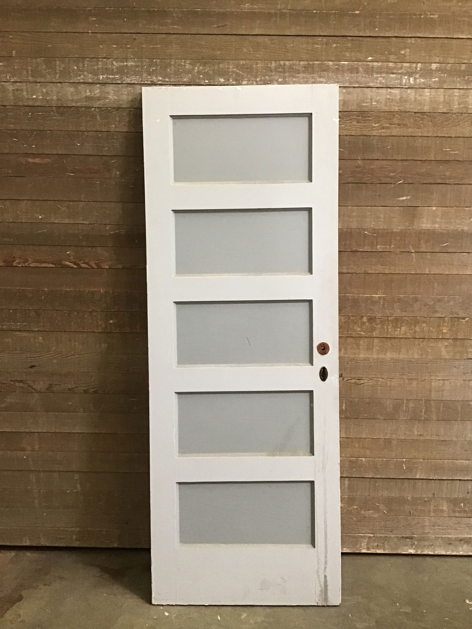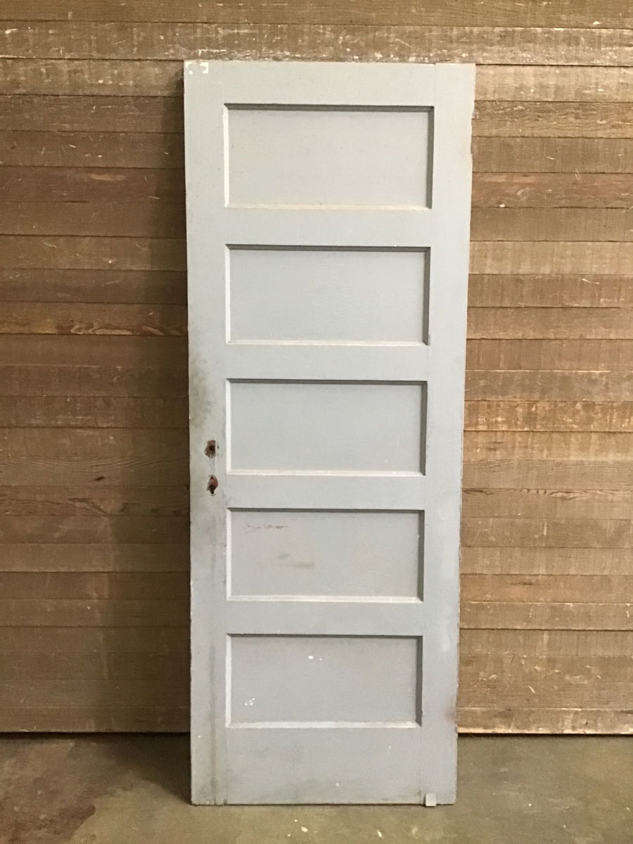 Vintage fir 5 panel door. Has some cosmetic damage from its long life of use, but in overall good solid shape. Bottom has been cut at a slight angle, the height change is 1/4" from one corner to another.